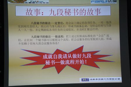 “A+B=C”普通的加法是否也是人生成功的標(biāo)尺?施老師用簡(jiǎn)單的“問題+心態(tài)=結(jié)果”詮釋了崗位職責(zé),成就自我必備的基本心態(tài)等。課中,施老師與大家共同參與了“九段秘書”的互動(dòng)游戲,讓大家從游戲中體會(huì)一個(gè)“九段秘書”的工作流程,從中聯(lián)系到自己的崗位,如何全面有效的完成工作,提升自身素質(zhì)!